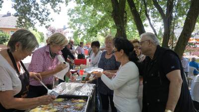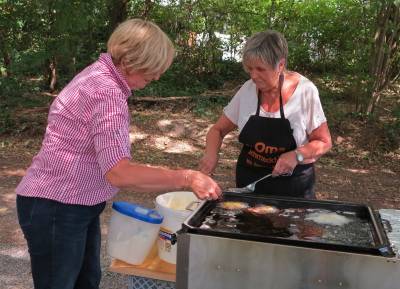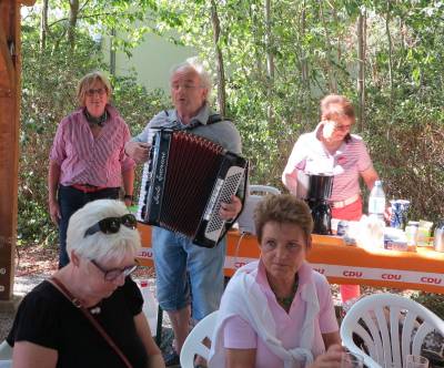 Die Damen der Frauen Union hatten sich alle Mühe gegeben, die Wünsche ihrer Gäste zu erfüllen. Rievkooche, Bier und alkoholfreie Getränke fanden reißenden Absatz, Toasts und kleine Plätzchen wurden liebevoll gereicht und Wolfgang Jägers, der Akkordeonvirtuose begeisterte mit seinen Kölschen Liedern ein heiteres Publikum. Selbst an ein Dixiklo hatten die Damen gedacht und an das Rauchverbot im gefährdeten Waldrand.